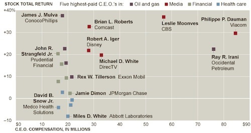 What I always wish I could see more of were direct international comparisons. Not only do high-paid oil and gas CEOs all get paid roughly similar amounts of money despite drastically different performances, but running a large American oil company is much more lucrative than running the giant French oil company. Anglophone firms just pay CEOs much more than continental European firms or Japanese firms. Meanwhile, though pretty much all firms are happy to discover and apply some new methods to hold down labor costs you rarely if ever see a firm bragging about its success in reducing executive compensation.