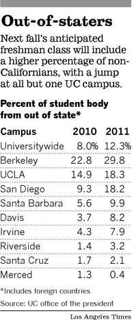 Matthew Kahn and Michael O'Hare both hail the trend toward more out of state enrollments in the University of California system. Kahn, the economist, makes the economist's case: "When you produce a high quality product, you can raise price without losing your market share [...] With the extra revenue, UCLA could subsidize tuition further for the needy."