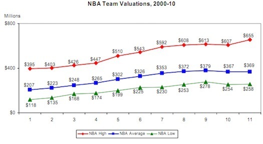 It's particularly worth noting that several of the teams who've lost the most franchise value have been fairly catastrophically mismanaged (I'm looking at you Minnesota), which is hardly the NBAPA's fault. All things considered, the vast majority of the owners have nothing to complain about in terms of their financial fortunes over the past few years (years that have been unkind to the finances of many Americans!) and among the minority who may have "lost money" in some real sense, most primarily have themselves to blame and all are in possession of valuable financial assets. Even the lowly Memphis Grizzlies are estimated to be worth $266 million.