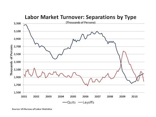 It's also worth noting that there's a special problem here in a non-recession context. If you look at the JOLTS data, it's clear that even during periods of healthy growth, plenty of people get laid off. A recession doesn't so much reflect a spike in people leaving their jobs as much as it does a collapse in new hiring. Indeed, people get so afraid to quit during a recession that quits + layoffs actually declines and the unemployment increase is on net entirely a matter of nobody getting hired: