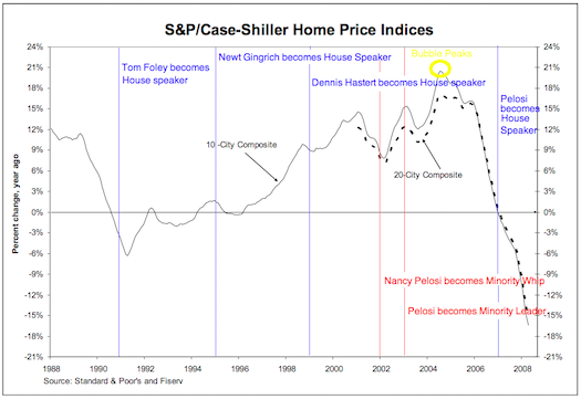 Are we supposed to believe that Pelosi did all this mischief from the minority bench of the US House of Representatives? That much of it happened before she even led the Minority caucus? That, if true, would be a genuinely extraordinary tale of how it is the President of the United States, the entire Senate, and the Speaker of the House were foiled in their efforts to overhaul the American financial system by Pelosi's wiles. Alternatively, maybe during her four-year spell as Speaker, Pelosi traveled back in time and forced the congress to forego appropriate regulation. Either way, it's an impressive show.
