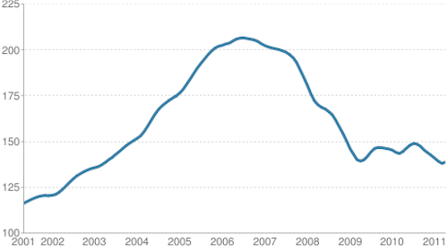 What I think is interesting about this is that while we clearly are staying well-below peak, it also looks to me like there's no real reason to think we'll revert all the way to the index level of 100. It looks, in other words, like we had a lot of irrational exuberance and that we also did have an upward transformation in the equilibrium price of a home. The transformation, I suspect, would be driven by the increasing quality of life in a number of supply-constrained metropolitan areas (most notably the San Francisco/San Jose, Greater New York, DC/Baltimore, and Greater Boston Consolidated Statistic Areas). There's a story here about real estate prices, but also about the general phenomenon of financial bubbles. Looking at something and saying "This is out of whack" is much, much, much easier than figuring out exactly how out of whack it is or when the out-of-whackness will peak. We need systems that are more resilient to bubbles, but it's unrealistic to think we're going to build systems that are based around detecting and popping them.