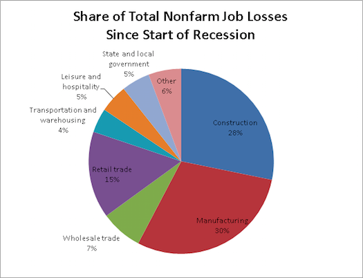 Here courtesy of Matt Cameron is a pie chart showing which sectors have accounted for what shares of job losses since the recession began: