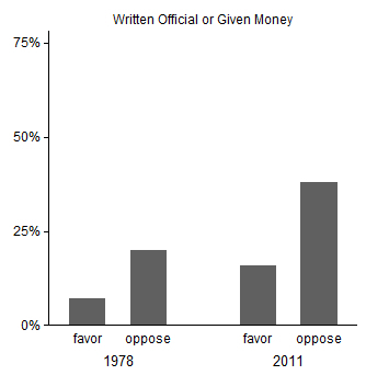 Something I like to ask people who are disgruntled with the performance of the political system is what have you, personally, done about it? When was the last time you wrote or called your member of Congress? Can you even name the people who represent you in the state legislature and have you written or called them? Howard Schuman with a detailed study of whether or not people should be required to get a police permit before they can buy a gun (via Jon Sides) illustrates the importance of such things. In 1978, such a permit requirement was favored 65 percent to 42 percent. By 2011, support had dropped somewhat but it was still popular, 57 percent to 43 percent. So why don't gun controllers win? Surprisingly, it's not preference intensity as measured by asking people if they feel strongly about the issue. Nor is it preference intensity as measured by asking people, "How important is a candidate's position on permits for guns when you decide how to vote in a Congressional election?"