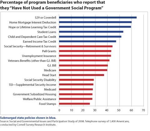 Suzanne Mettler has turned her important research on perceptions of government programs into a popular article for the Washington Monthly. The key point is, I think, well-summarized by this chart: