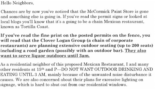 A coalition of NIMBYs living in an expensive apartment building near Logan Circle are upset about a proposed plan to increase business activity in their neighborhood: