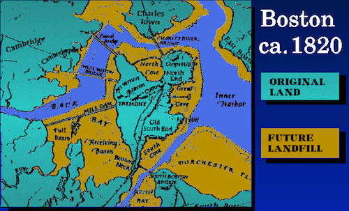 It's interesting to me that we don't seem to do these large-scale land creation projects anymore. Look at how much bigger Boston got through landfilling. Not only did that creation of the Back Bay area greatly expand the city, it fundamentally alters the geography of Cambridge, which would be much more isolated from the main city with a giant bay over there instead of a small river.