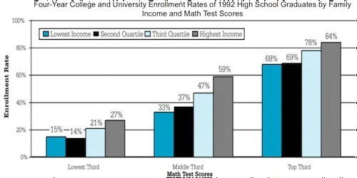 What you see here is that across the board there clearly is a fair amount of pure selection going on. The smartest kids are most likely to go to college, so it's no surprise that college graduates tend to go on to earn more money even if you're not learning anything of value there. But per Leonhardt, it's clear that on average, people actually do pick up skills in college, and per Orszag, it's clear that among kids of roughly average intelligence, whether or not your parents are rich is a major determinant of whether or not you end up going to school and gaining those skills. This is a big problem. If middle-third kids from families in the bottom half of the income distribution went to college at the same rate as middle-third kids from the top quartile, they'd be better off and we'd have a much more skilled workplace.