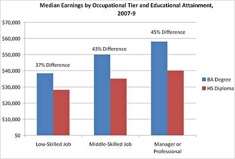 Another study being released this weekend — by Anthony Carnevale and Stephen J. Rose of Georgetown — breaks down the college premium by occupations and shows that college has big benefits even in many fields where a degree is not crucial.