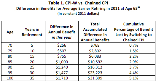 As long as the idea of switching to the use of the Chained CPI is in the news it's worth emphasizing that though the scale of the cut to Social Security benefits implied by doing this is very small, it falls quite heavily on people who are very old since it compounds over time. Social Security Works has a table (PDF):