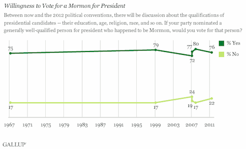 Though the vast majority of Americans say they would vote for their party's nominee for president in 2012 if that person happens to be a Mormon, 22% say they would not, a figure largely unchanged since 1967.