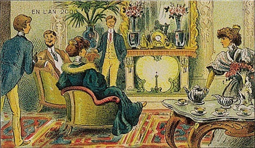 Via James Fallows, a great exhibit from the French National Library of prints from 1910 depicting the utopian lifestyle of 2000. A lot of them involve weird air travel, but my favorite is this idea of using dangerous nuclear isotopes to replace your fireplace ("chauffage au radium"):