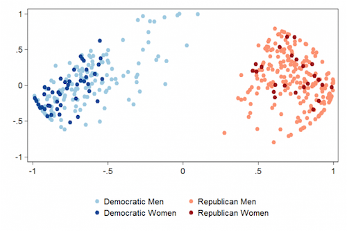 Here's a fascinating finding from Nate Birkhead about gender, partisanship, and ideology in the U.S. House of Representatives. As measured by DW-NOMINATE scores, Republican men and Republican women are the same. But Democratic women are much more liberal than their male counterparts: