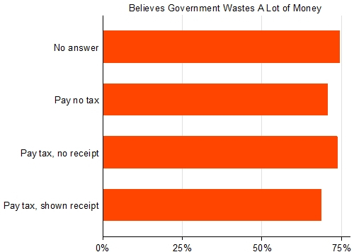 John Sides reports on a YouGuv study that showed a receipt to some people and tested its impact on public opinion. There turns out to be a very small impact on belief that the government is full of waste and even smaller impacts on other things: