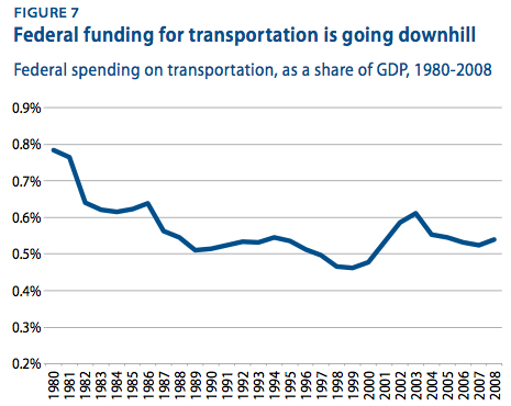 Have you noticed how America's transportation infrastructure seems pretty shoddy? Like everything's broken all the time and new projects don't get completed. Why's that? Because government just sucks? Well, maybe. But as CAP's new "Budgeting For Growth" document points out, a big part of the answer is that since the Reagan Revolution we've been disinvesting in this area: