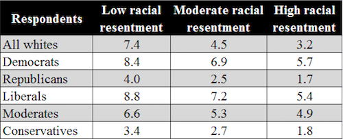 The results in Table 2 show that racial resentment was strongly related to ratings of Obama and that this relationship persists even after controlling for party identification and ideology. Regardless of party identification or ideology, whites who scored high on the racial resentment scale had substantially more negative opinions of Obama than those who scored low on the racial resentment scale.