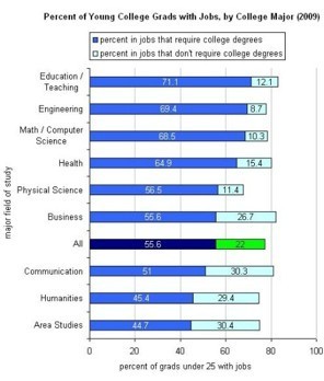 Via Catherine Rampell, research from Andrew Sum on job placement by college major can be found over on the right. Ezra Klein deems this "fairly depressing" as "[a]bout a quarter of college graduates don't have jobs, and an additional 22 percent don't have jobs that use their degree."