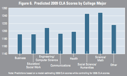 What this chart attempts to do is show gains in Collegiate Learning Assessment scores by major-type when controlling for the characteristics of the people who go into different fields. What it shows is that not only do education and business majors generally start college with worse test scores than people in the traditional math/science/social science/humanities sphere they generally seem to learn less while in college as well. So even though education majors do much better than humanities majors at getting jobs that require a college degree, that looks to me like it's plausibly an artifact of regulatory policy or BLS categorization. There may be lots of jobs that don't require a college degree but for which the kind of general skills ("including critical