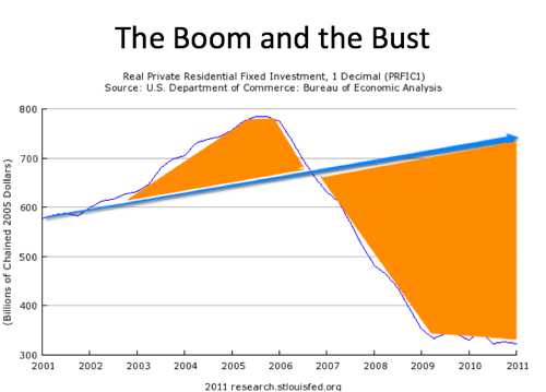 An excellent chart from Brad DeLong's talk at the Urban Land Institute conference makes a point that few people realize—the net impact of the housing boom and the housing bust is that we now appear to have a substantial housing shortage in America: