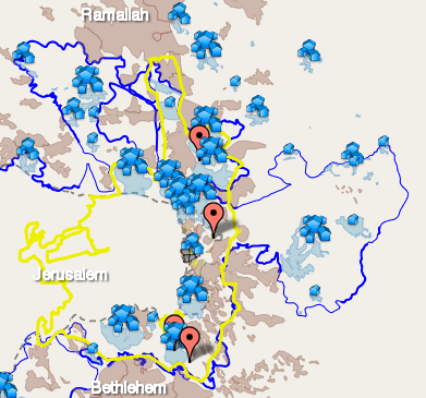 Something I didn't understand about today's presidential speech was the idea that resolution of the Jerusalem issue could somehow be deferred in favor of first negotiating a settlement about borders, based on the 1949 cease fire lines. The old cease-fire lines ran right through Jerusalem. Here's a map showing (in yellow) the Israeli-defined municipal boundaries of Jerusalem, the Israeli-built security wall, the old cease-fire line, and Israeli settlements in the Jerusalem area: