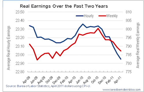 Jared Bernstein notes the interesting fact that for the bulk of the recession real wages were actually going up for those of us who managed to not lose our jobs. But that's turned around: