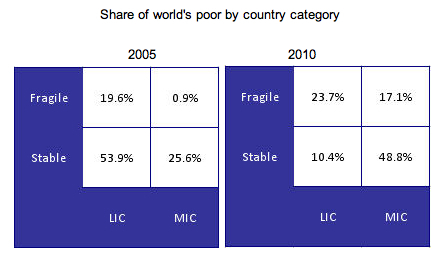 It seems intuitive that poor people would live in poor countries, but the combination of rapid economic growth in China and India with those countries' gigantic populations means that's no longer the case. Today, most poor people live in middle income countries according to an analysis from Laurence Chandy and Geoffrey Gertz for Brookings which also notes that many of the global poor live in states that are "fragile" in terms of their stability:
