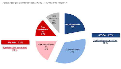 Via Erik Voeten, a survey (PDF) shows that 57 percent of all French people and 70 percent of French Socialists think former IMF chief Dominque Strauss-Kahn is the victim of a setup: