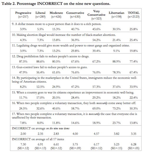 Daniel B. Klein and Zeljka Buturovic did a study about a year ago that you may have heard about which purported to show that self-identified liberals and progressives had lower levels of understanding about economics. One response that occurred to me at the time was that the survey's questions seemed to have been selected so as to ensure that the left-wing answer was also the wrong one. Now they've run a new study with different questions and the results appear to indicate that the gap is, indeed, all about which questions you ask: