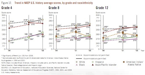 What he's saying here is that he wants to implement a test that woud be difficult enough for some non-trivial share of the American public to be disqualified, specifically the graduates of low-performing high schools. And it's no secret that African-Americans and Latinos are disproportionately concentrated in said schools. And, indeed, the 2006 History NAEP shows significantly lower scores for blacks and Hispanics: