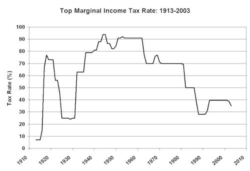 Now what's interesting about this is that the right has been winning this argument for decades. In particular, since the Kennedy administration we've seen very steady reductions in the marginal income tax rates paid by high earners: