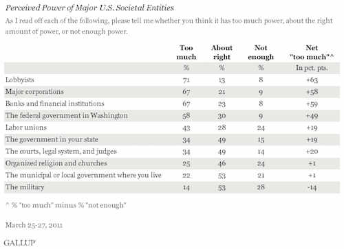 Here's the latest from Gallup on which institutions Americans think should have more and which should have less power: