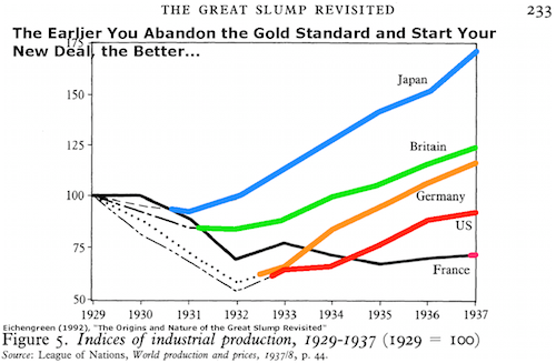 Several points in response. One, it might interest Pawlenty that the United States of America has been on "fiat money" since at least 1933. Two, it might interest Pawlenty that when the Franklin Delano Roosevelt administration took the dollar off the gold standard he was roundly denounced by conservatives for debasing the currency. Three, it might interest Pawlenty that cross-nationally monetary debasement proved to be a highly effective strategy for increasing real output during the Great Depression: