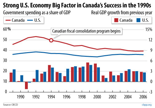 What's more, I think you could make a strong case that given Canada's situation a fiscal consolidation program was necessary to implement expansionary monetary policy. That's not the case for the United States today. Some people think we could conduct monetary stimulus regardless of fiscal policy and there's also a credible case that fiscal expansion is needed to make monetary stimulus work. But we're just not in the Canada situation where we need to cut the budget to facilitate interest rate cuts.