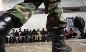 For a month, gangs of young gunmen have roamed the city, rousting Libyan blacks and immigrants from sub-Saharan Africa from their homes and holding them for interrogation as suspected mercenaries or government spies. [...] "We know who they are," said Abdelhafed Ghoga, the chief opposition spokesman. He called them "people with bloodstained hands" and "enemies of the revolution." [...] One young man from Ghana bolted from the prisoners queue. He shouted in English at an American reporter: "I'm not a soldier! I work for a construction company in Benghazi! They took me from my house … " [...] The Ghanaian was one of 25 detainees from Chad, Niger, Sudan, Mali and Ghana described by opposition officials as mercenaries, though several of them insisted they were laborers. The officials declined to say what would become of them. [...] One of the accused shown to journalists was Alfusainey Kambi, 53, a disheveled Gambian wearing a bloodstained sport shirt and military fatigue trousers. He said he had been dragged from his home and beaten by three armed men who he said also raped his wife. A dirty bandage covered a wound on his forehead.