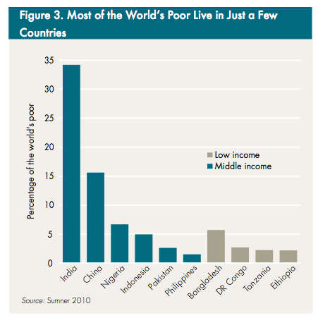 A new report from Andy Sumner at the Center for Global Development looks at the fact that thanks to economic growth in some poor countries, most poor people now live in middle-income states rather than poor ones. Specifically: