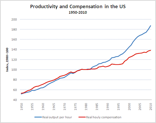 A healthy share of this is clearly the growing role of mega-rich financiers. Another chunk of it is superstar entertainers. But as Mike Konczal suggests, I think Federal Reserve policy is another important driver here. You had a period when real compensation grew faster than productivity, then you had a span of stagflation, and then we've had a long period wherein wages basically don't increase in part because the Fed doesn't want wages to increase.