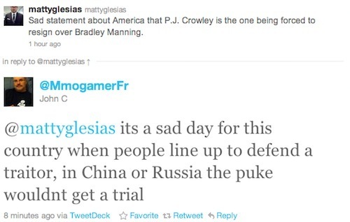 This kind of thing makes me slightly hopeful about America. Bradley Manning, of course, hasn't had a trial. But it's obvious that many of the people who think they favor what's being done to him don't actually realize this. They take it for granted that in the United States of America punishment is for people who've been put on trial and convicted of crimes.
