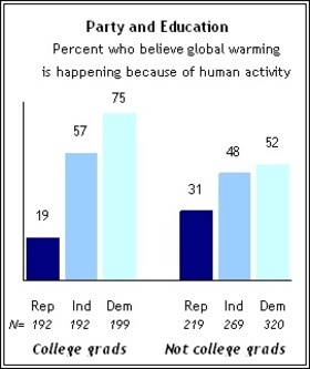So consider that among self-identified Republicans, getting more education makes you less informed about global warming. But that's not because Republicans with BAs are ignorant compared to Republicans without them. On the contrary. Republicans with BAs are better informed about what the Republican view is and therefore worse informed about the underlying issue because the Republican position is mistaken.