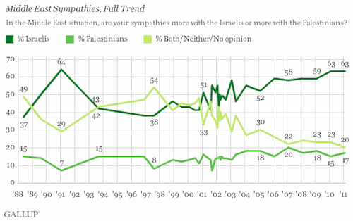 Note that this is a real change. Israel has always had more sympathizers than the Palestinians, but pre-9/11 a kind of neutralism was the predominant view. Under those circumstances, lobbying for one-sided policies was pretty challenging. But Israel's commanding position in public opinion over the past decade makes it basically child's play.