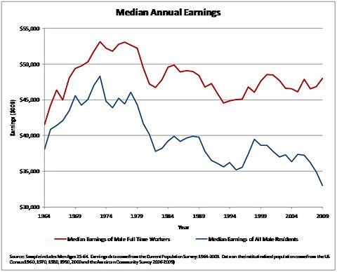 I think this is a reminder that we don't see enough discussion of feminism as an economic phenomenon. What's been the macroeconomic policy response to a substantial increase in the potential labor force? Is this decline in male workforce participation a sign of bad labor market conditions, or the statistical manifestation of social change in gender roles? What's the workforce participation rate we want to have?