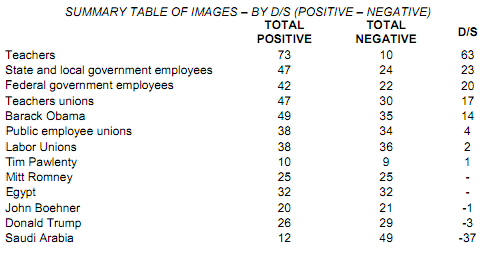 The disparate polling for "teachers," "teachers unions," and "labor unions," is telling. Among political elites, virtually everyone is more critical of teachers unions than of unions in general. But the voters like teachers a lot. So the voters' view of teachers unions is basically a mix of their feelings about teachers (strongly positive) and their feelings about unions (very mixed). Consequently, teachers unions get pretty good marks.