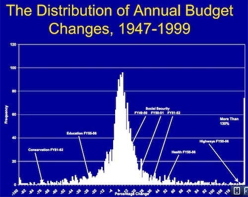 One way they characterize this mathematically is to show that the probability density of policy changes has "high kurtosis" rather than being normally distributided. That means you get a very high peak and a large influence of extreme outcomes, with very little in the way of moderate change. This chart illustrates the point with regard to budget outlays: