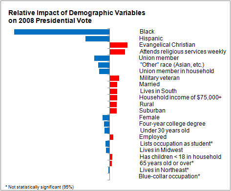 I'm familiar of course with the fact that union households are more inclined to vote Democratic than are members of non-union households, but since union membership isn't distributed randomly amongst the population it's a bit difficult to know exactly what to make of that. Nate Silver, however, took National Election Survey data to do a logistic regression analysis to try to isolate the impact of specific demographic characteristics on the 2008 presidential vote: