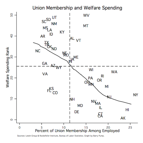 It would be interesting to know more about this. There's a difference, after all, between how generous a program is and how expensive it is. One program might hand out money to poor people. Another program might hand out money to poor people if and only if they pass regular drug tests and criminal background checks. The latter will likely be more expensive, since it's harder to administer, but the former seems more generous by any reasonable standard. Unions have reasons to lobby for generous, efficient programs (like Social Security, which labor is a key backer of) but also have reasons to lobby for making programs labor-intensive and letting service providers capture as large as possible a share of the appropriations. It would be interesting to see evidence on which effect dominates. Maybe a chart with "personnel costs as a share of state expenditures" on the y axis would be illuminating.