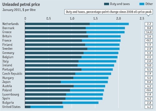 Ryan Avent offers a chart of "petrol" prices in the developed world: