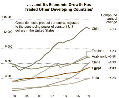 Egypt's economic problem is quite profound. It's not rich enough for households to shrug off increases in the price of wheat and other commodity foodstuffs and it doesn't have the power to halt negative shocks to world food supply from climate change and poor management of water resources. Consequently as long as Egypt grows slower than the world average, it's going to be at risk for fall-behind immiseration every time the world has a bad harvest season. And it's not the only country in this boat.