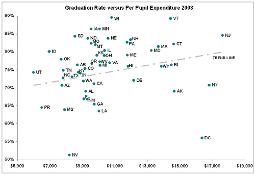 I don't know what firm conclusions you can draw from that scatterplot, but it seems to be saying that within the United States of America some states are getting more value for their money than others. Very white states and low poverty states seem to do better, but even if you try to look at pretty similar states (New Jersey and Connecticut, Maine and New Hampshire) you see big differences.