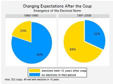 Hein Goemans and Nikolay Marinov find that nowadays coups generally lead to new elections rather than to stable dictatorships: