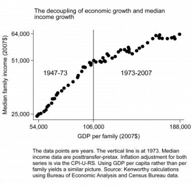 Lane Kenworthy argues that we haven't just seen a growth slowdown over the past 35 years, we've also seen a decoupling of growth and median living standards. He illustrates it thusly: