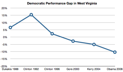 Which is just to say that in the very recent past, West Virginia was a considerably more-Democratic-than-average state. We're not talking about the distant past or Harry Truman Democrats or whatever. Even post-civil rights, post-Roe, post-Reagan, post-"wedge issues," post everything Michael Dukakis Democrats were more popular in West Virginia than they were in the country at large. By contrast, Al Gore, John Kerry, and Barack Obama have all been less popular in WV than they are nationwide. And increasingly so.